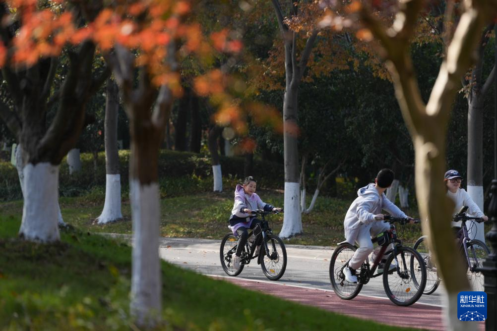 11月30日,市民在绍兴迪荡湖景区绿道骑行。