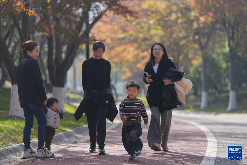 11月30日,家长带着小朋友在绍兴迪荡湖景区玩耍。