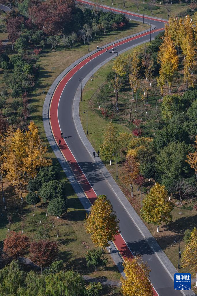 11月30日,市民和游客在绍兴迪荡湖景区绿道休闲、健身。迪荡湖景区绿道是一条环湖骑行绿道,全长约8公里(无人机照片)。