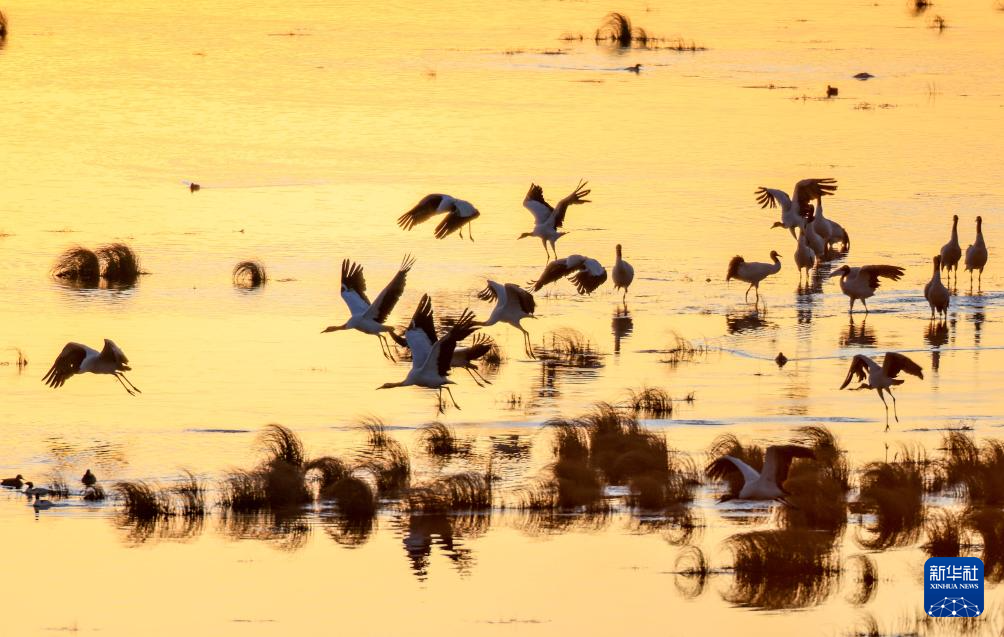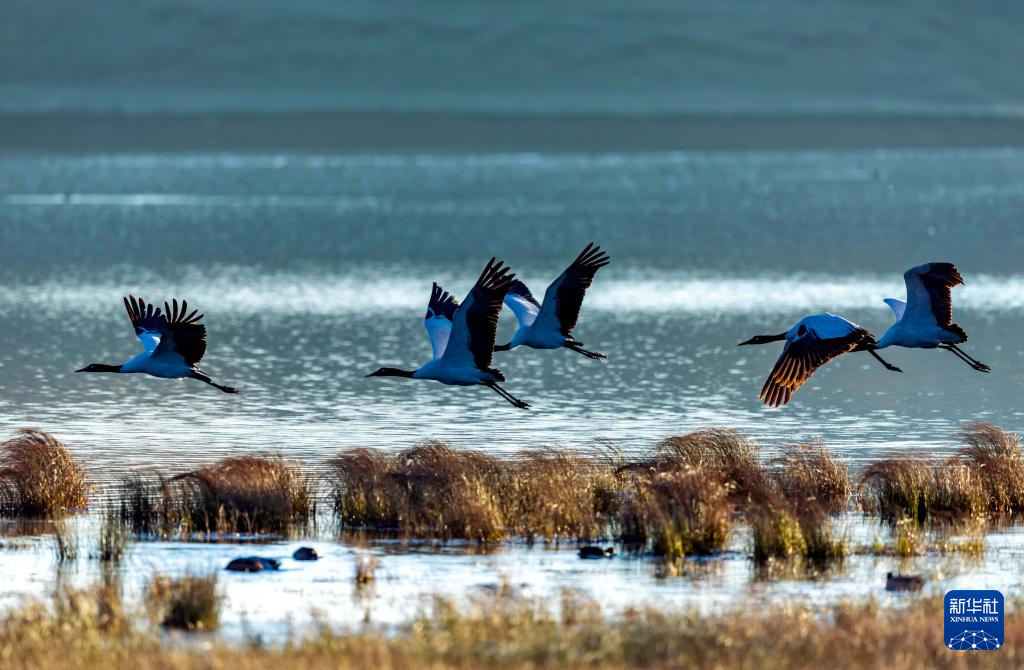 11月30日,黑颈鹤在大山包黑颈鹤国家级自然保护区内的大海子湿地飞舞。