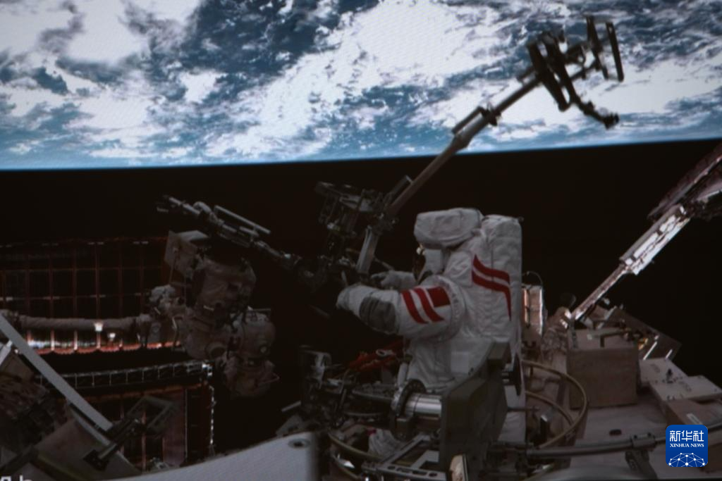 这是12月9日在北京航天飞行控制中心屏幕上拍摄的神舟二十一号乘组航天员张陆与武飞(右)在舱外工作的画面。