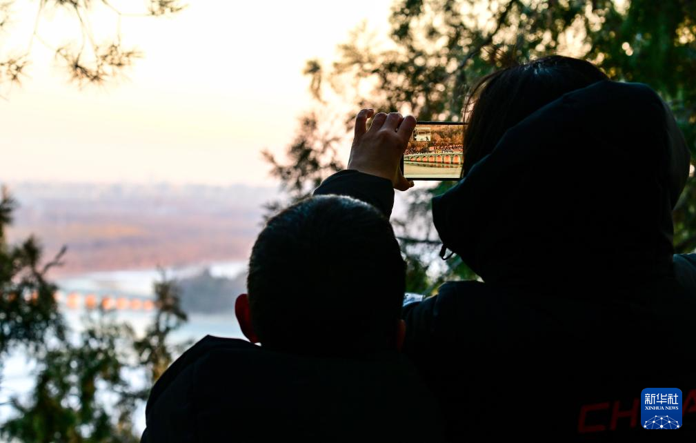 12月21日,游客在颐和园万寿山上拍摄十七孔桥“金光穿洞”美景。