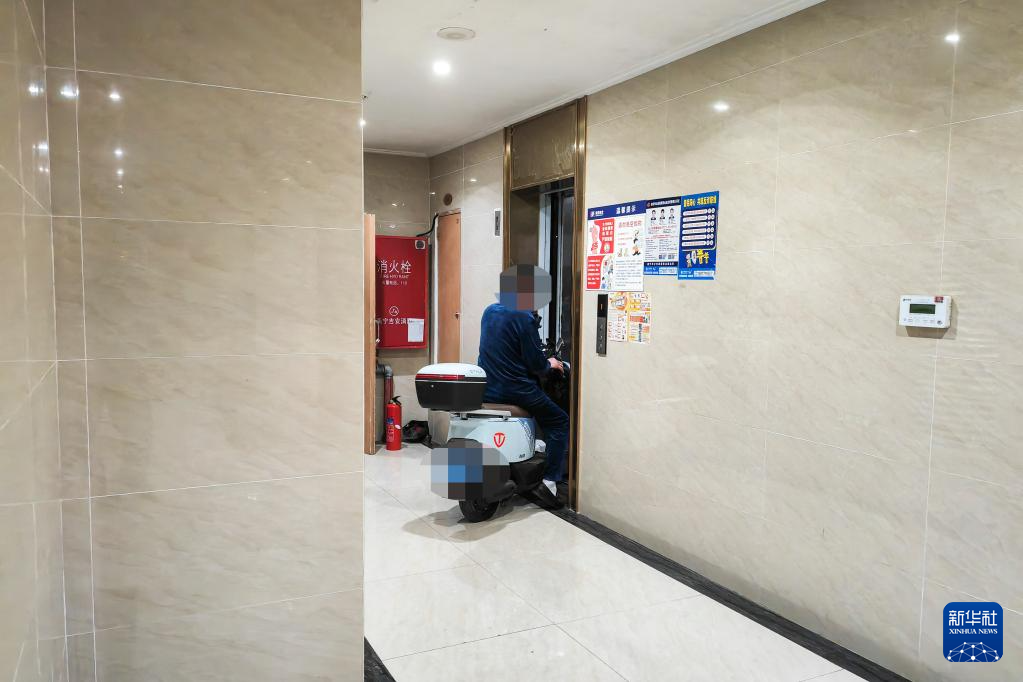 在广西某市一小区,居民骑着电动自行车进入电梯(12月3日摄)。