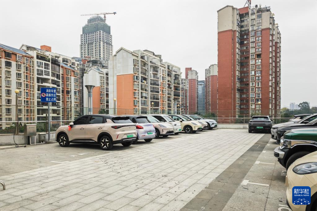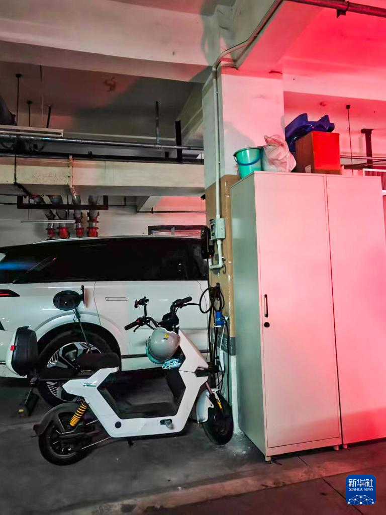 在四川某市一小区,业主在车位旁“飞线”充电,旁边私设的储物柜上放置可燃物(12月5日摄)。