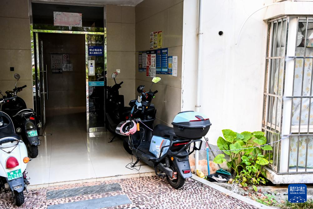 在广西某市一小区,住户将电动自行车停放在入户大厅门口进行“飞线”充电(9月20日摄)。