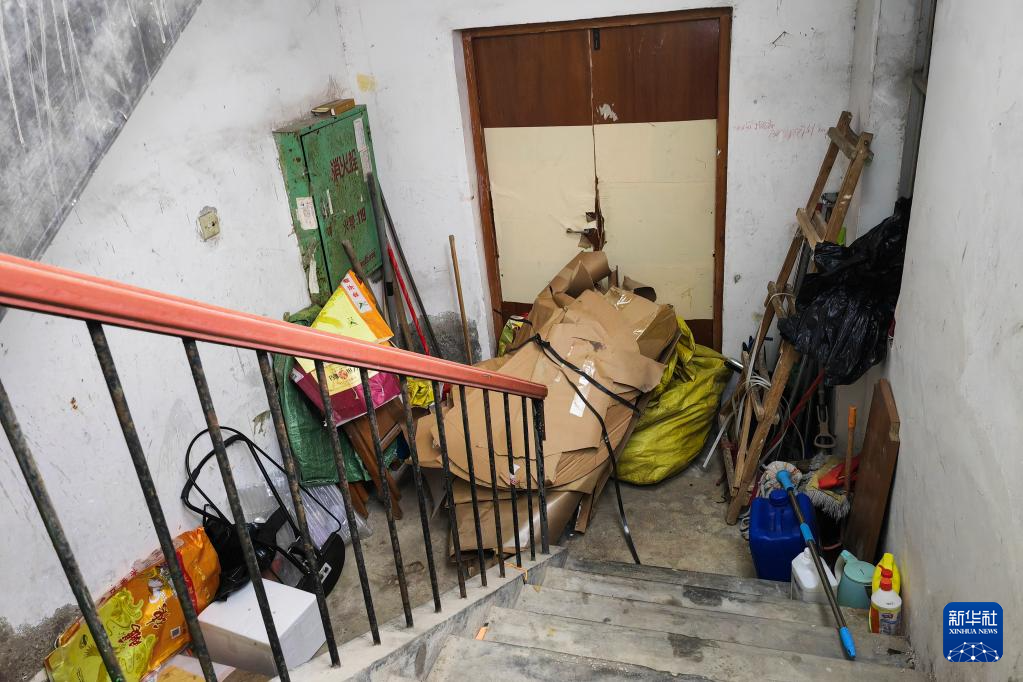 在广西某市一小区,杂物堆放在消防楼梯间内,将逃生防火门堵住(12月5日摄)。