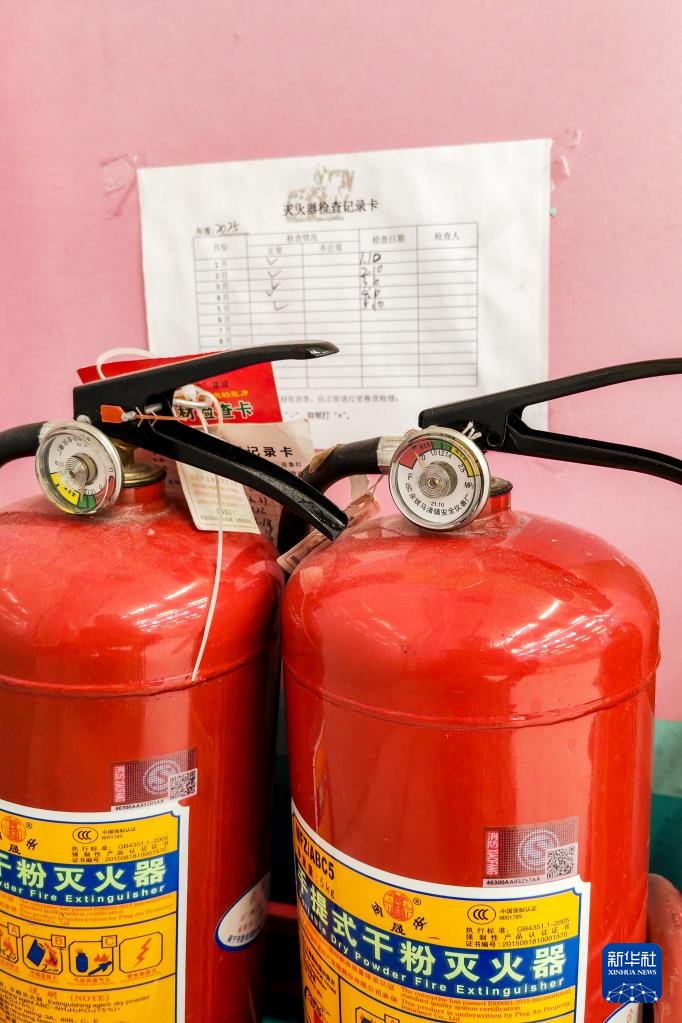 在广西某市一公寓楼内,灭火器(右侧)已经失效,墙上本应按月检查登记的记录卡,显示检查时间停留在2025年5月份(12月4日摄)。