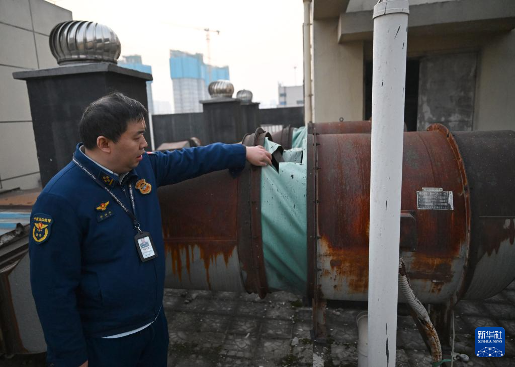 12月16日,消防人员在河南某市一小区检查楼顶烟雾排风机损坏问题。