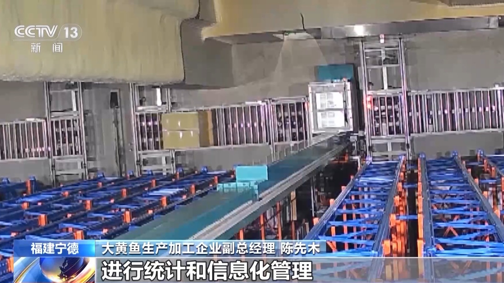 大黄鱼生产加工企业副总经理陈先木:我们的智能冷库一共有13层,高38米,库内容量达到1.5万吨。它能够全天24小时不间断装卸货物,自动进行货物的智能存取、搬运、分拣,同时,通过扫码出入库,系统还能精确对大批量的货物进行统计和信息化管理。
