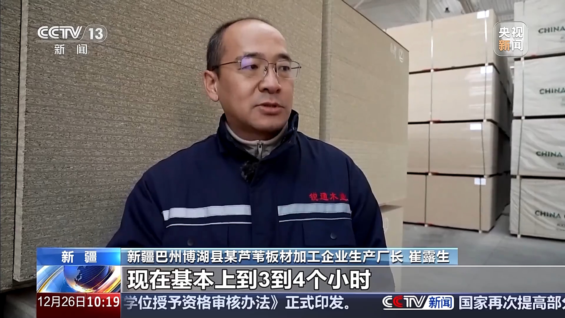 新疆巴州博湖县某芦苇板材加工企业生产厂长崔露生:运输时间就从原来的8到9个小时,现在基本上到3到4个小时,我们整个的运输成本的话预计会下降20%到30%。乌尉高速的开通,对于我们打通中亚市场也还有非常大的支持作用。