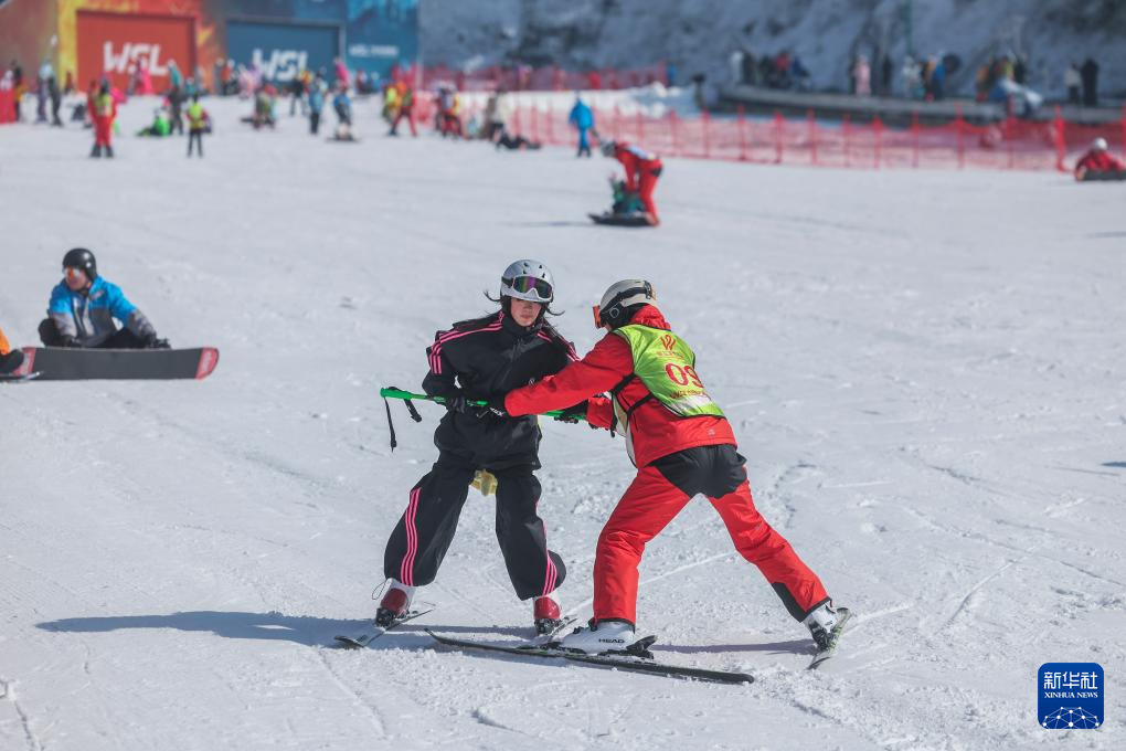 12月25日,杭州临安大明山万松岭滑雪场的教练在指导游客。
