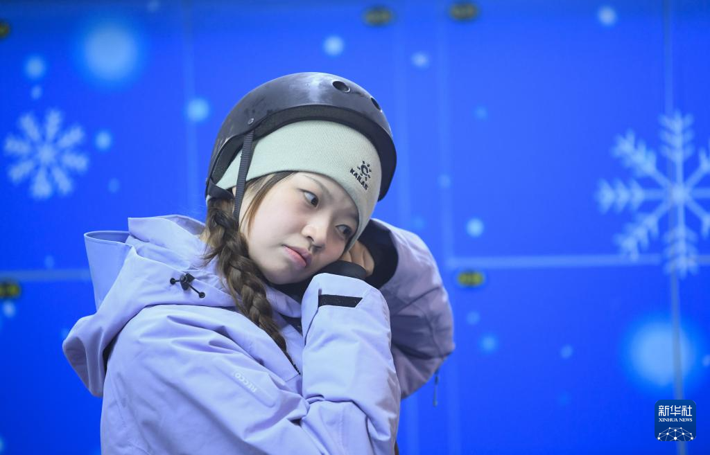 一名女子在绍兴乔波冰雪世界戴头盔准备进入雪场(12月24日摄)。