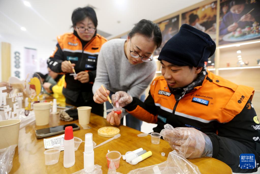12月30日,在江苏省连云港市连云区墟沟街道南山社区“‘新’手纳百财非遗迎新年”主题活动中,掐丝工艺师指导快递小哥制作非遗手作。