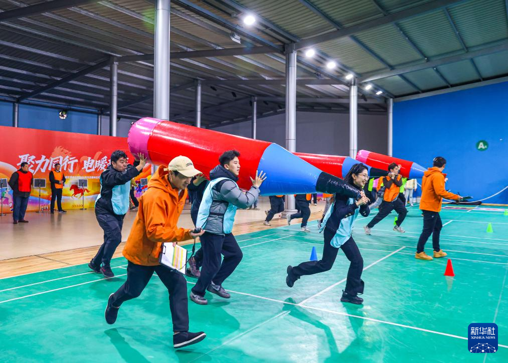 12月31日,在江苏省扬州市江都区某企业举办的趣味运动会上,员工在参加“神来之笔”活动。