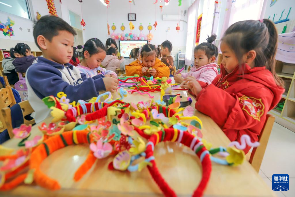 12月31日,河北省遵化市平安城镇中心幼园的小朋友在体验制作簪花。