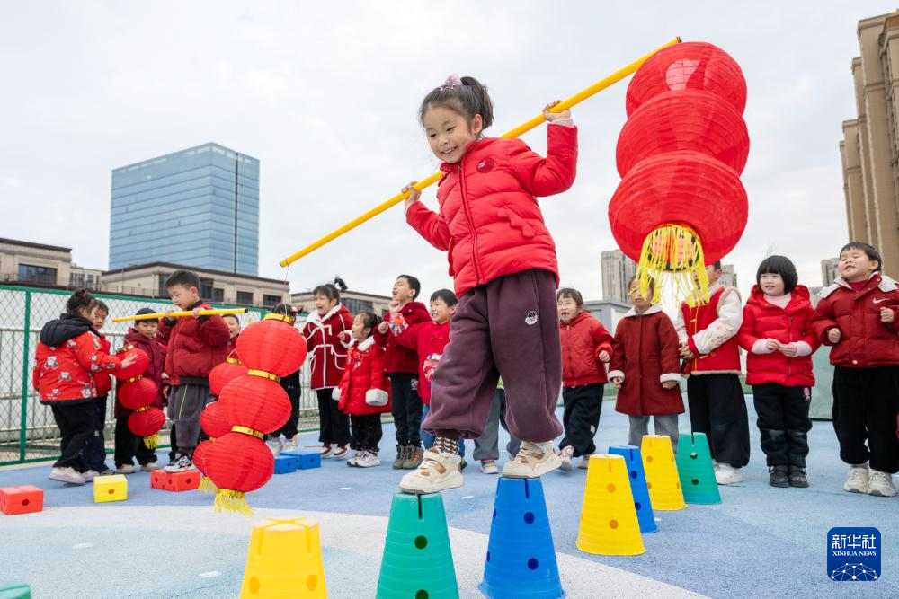 12月31日,浙江省湖州市长兴县奥园幼儿园,孩子们参与“灯笼蹦挑乐”趣味运动。