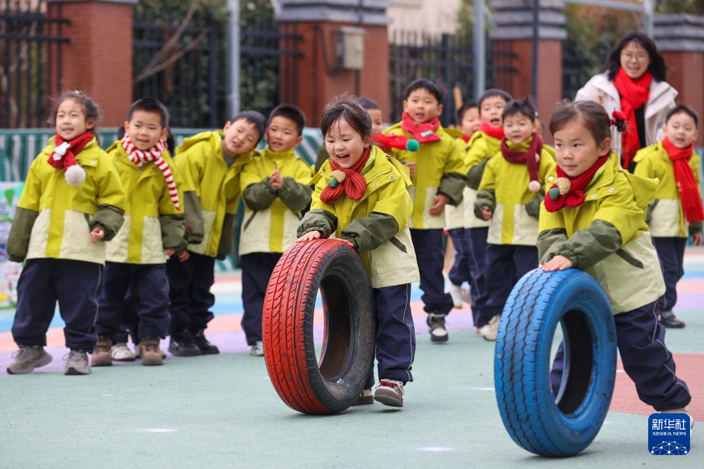 12月31日,在浙江省湖州市吴兴区埭溪镇中心幼儿园,学生进行滚轮胎比赛。