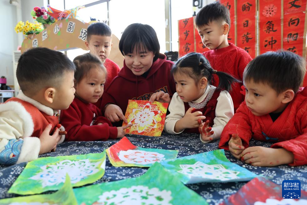 12月31日,在山东省滨州市沾化区第一实验幼儿园,老师教孩子们拓窗花。