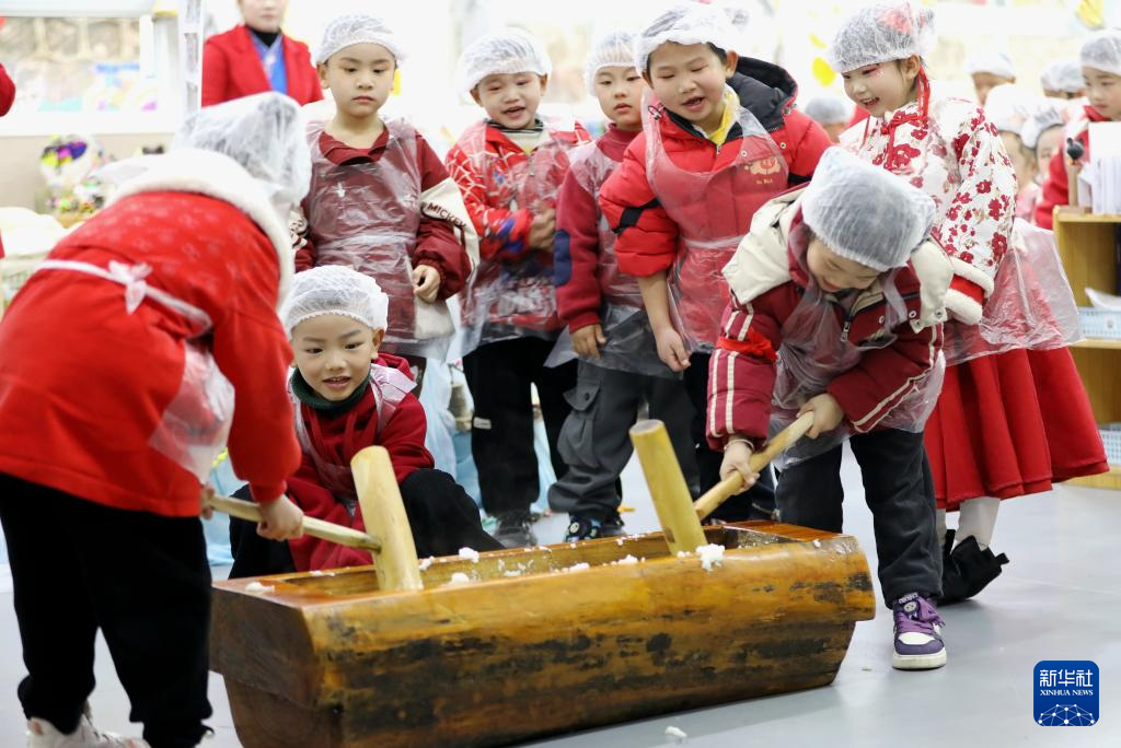 12月31日,贵州省黔东南苗族侗族自治州施秉县第二幼儿园的小朋们在迎新年活动中打糍粑。