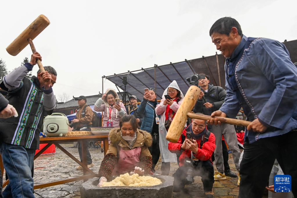 12月31日,在重庆市酉阳土家族苗族自治县两罾乡楠木湾景区,非遗传承人和演职人员为游人表演非遗文化节目。
