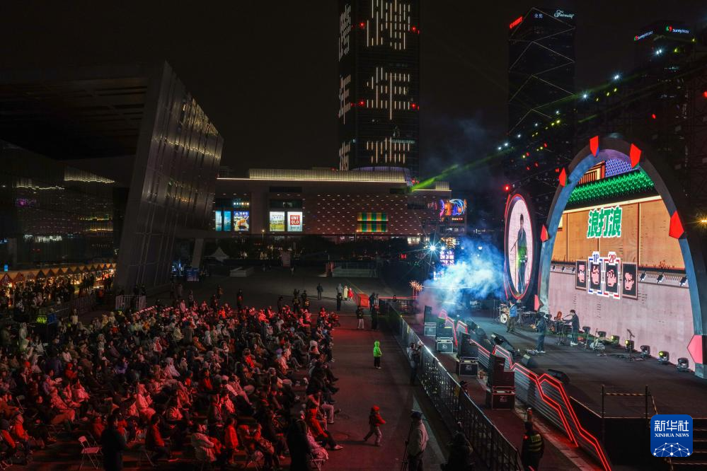 12月31日,江苏省南京市建邺区元通商圈举行迎新年活动,歌手在活动现场表演(无人机照片)。