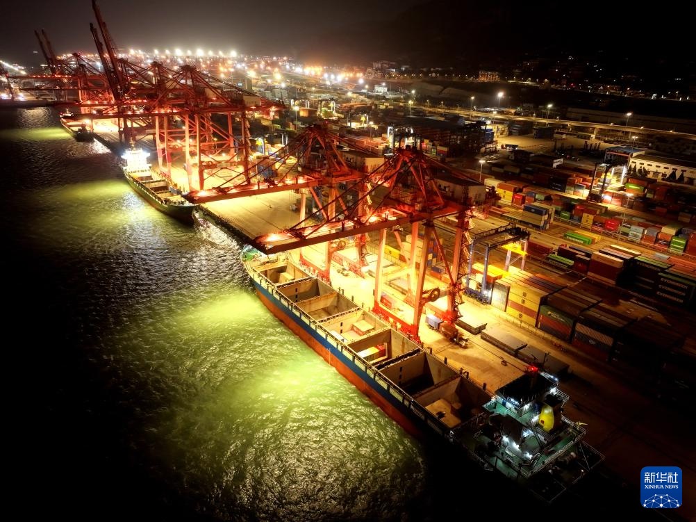 12月31日凌晨,在江苏省连云港港集装箱码头,货轮在泊位装卸集装箱(无人机照片)。