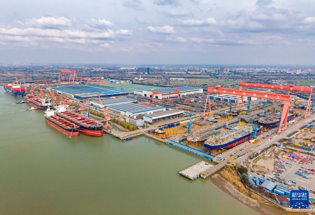12月31日,在江苏省扬州市江都区扬州中远海运重工有限公司,工人在生产厂区加紧造船(无人机照片)。