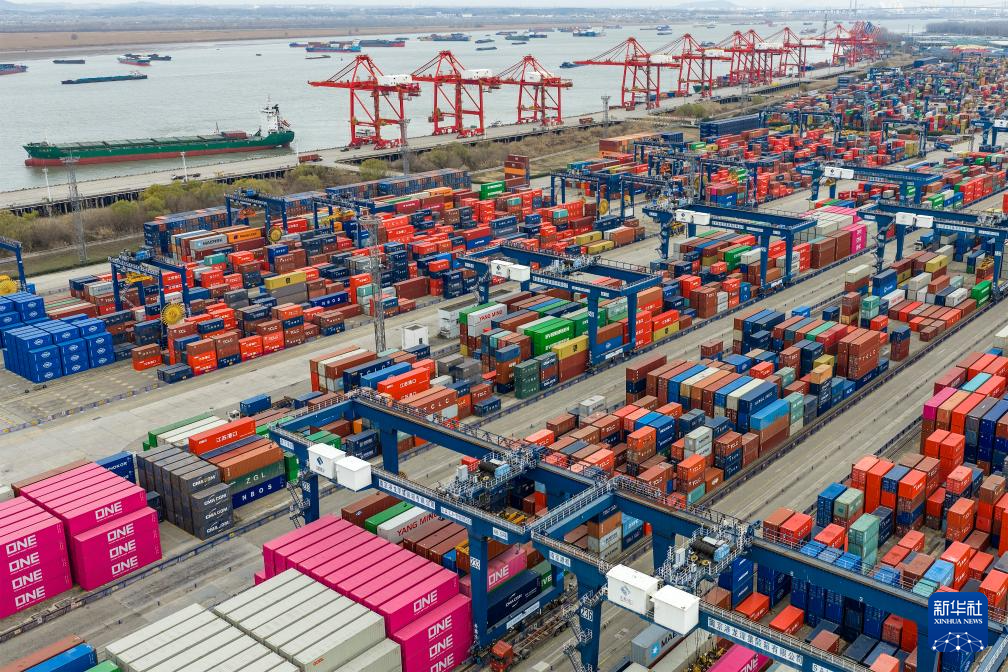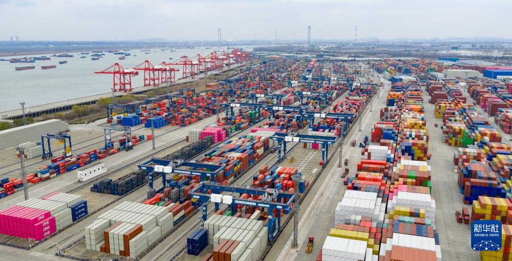 12月31日拍摄的江苏省港口集团南京港龙潭集装箱码头上的生产场景(无人机照片)。
