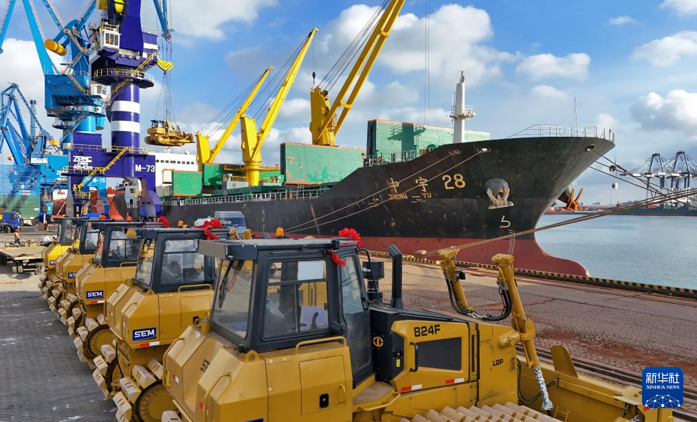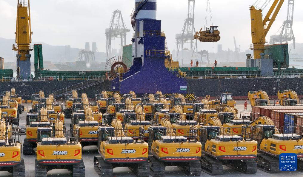 12月31日,在山东港口烟台港,烟台港至东南亚件杂货班轮在装运要出口印度尼西亚的国产工程机械(无人机照片)。