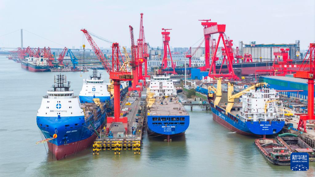 12月27日,在位于江苏省泰州市高港区的泰州三福船舶工程有限公司生产基地,多艘大型船舶在建造中(无人机照片)。