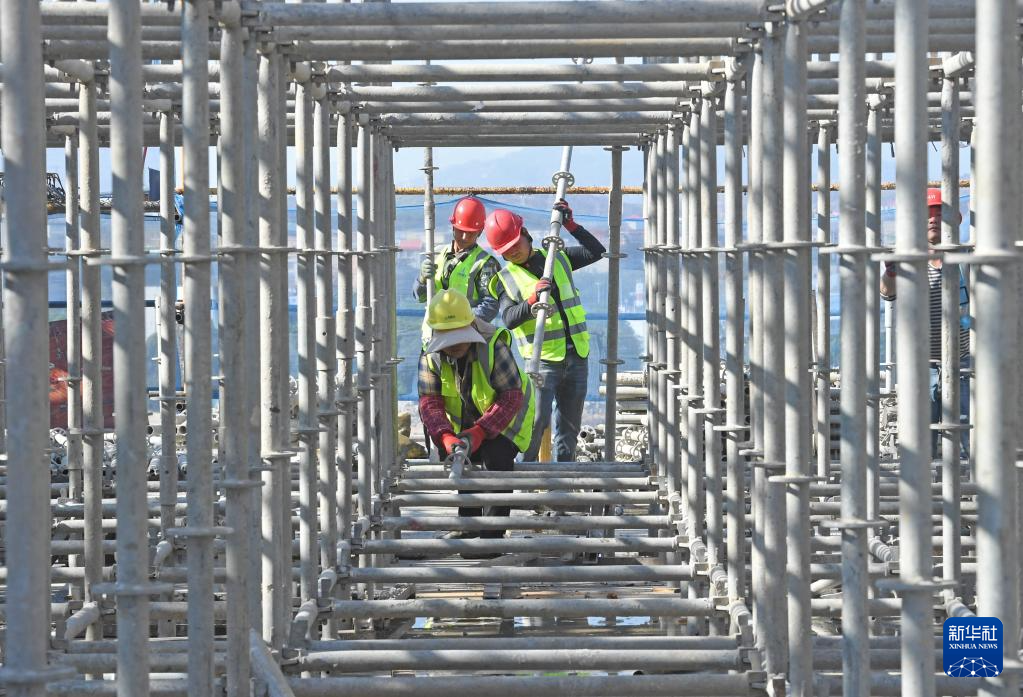 12月30日,在位于泉港石化工业园区的北瑞药业新型医药原料药及针剂项目施工现场,施工人员在搬运脚手架。