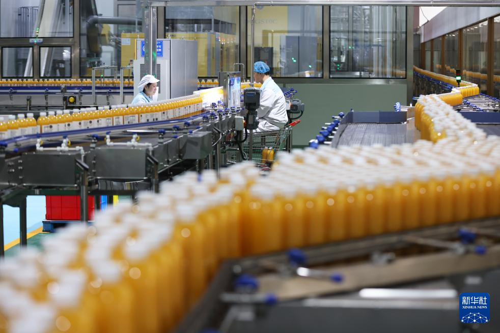 12月31日,工人在浙江省湖州市德清县乾元镇的一个生产车间内检查果汁产品质量。
