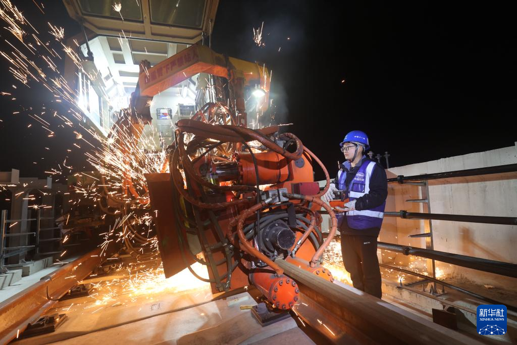 12月30日晚,在位于浙江省湖州市德清县的杭德市域铁路施工现场,中铁十一局工人进行钢轨焊接作业。