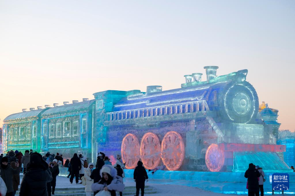 1月5日,游客在哈尔滨冰雪大世界园区游览。