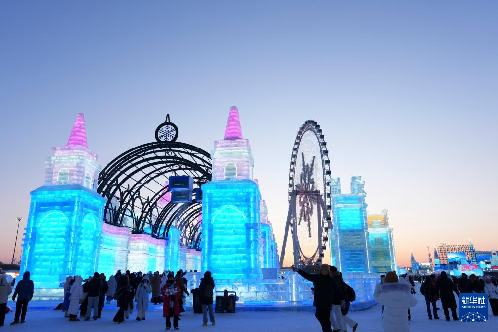 1月5日,游客在哈尔滨冰雪大世界园区游玩、拍照。