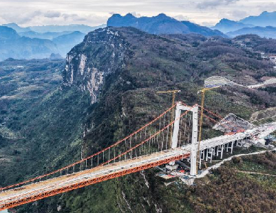 1月5日,随着最后一节钢拱精准吊装到位,贵州交投集团承建的安顺至盘州高速公路古牛河特大桥顺利合龙,为后续工程建设推进奠定了坚实基础。古牛河特大桥是安盘高速控制性工程,全长881.8米,主桥横跨古牛河,主桥桥面到谷底高度约400米。