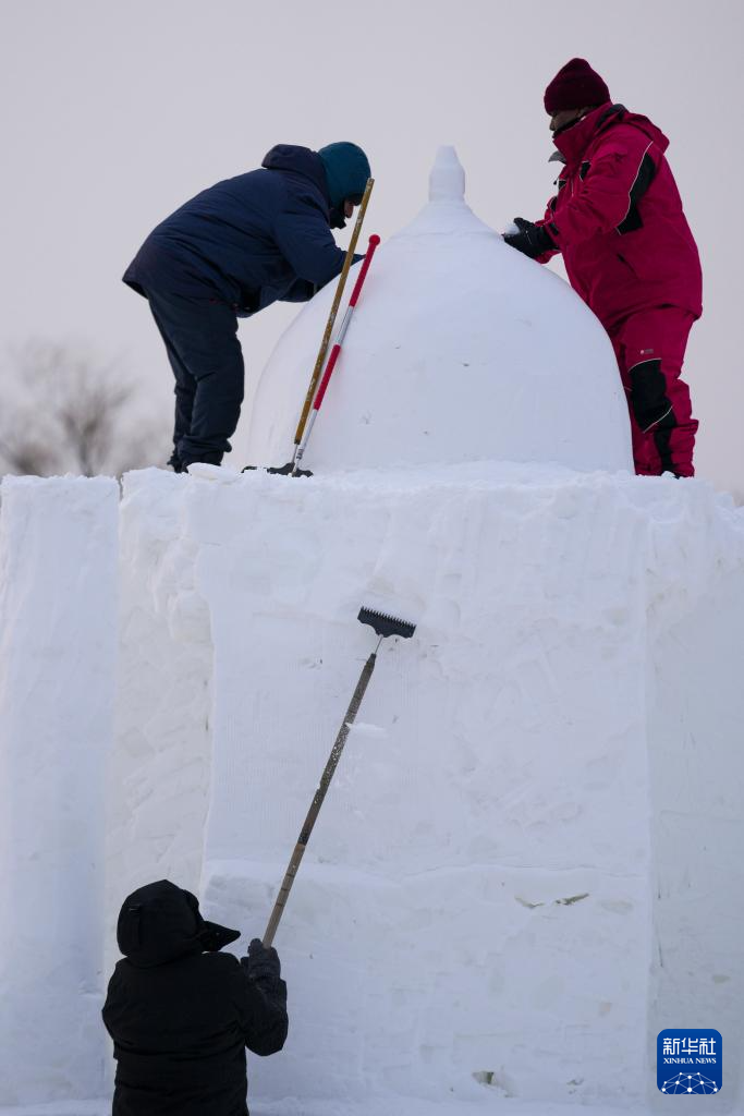 1月8日,在哈尔滨太阳岛雪博会第28届中国·哈尔滨国际雪雕比赛现场,选手进行雪雕创作。