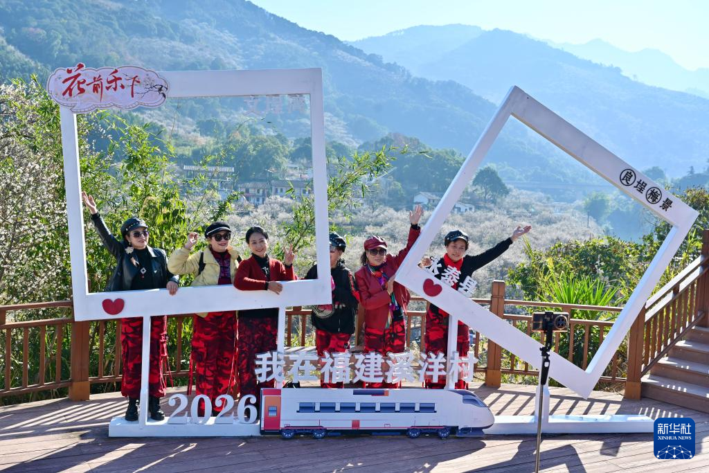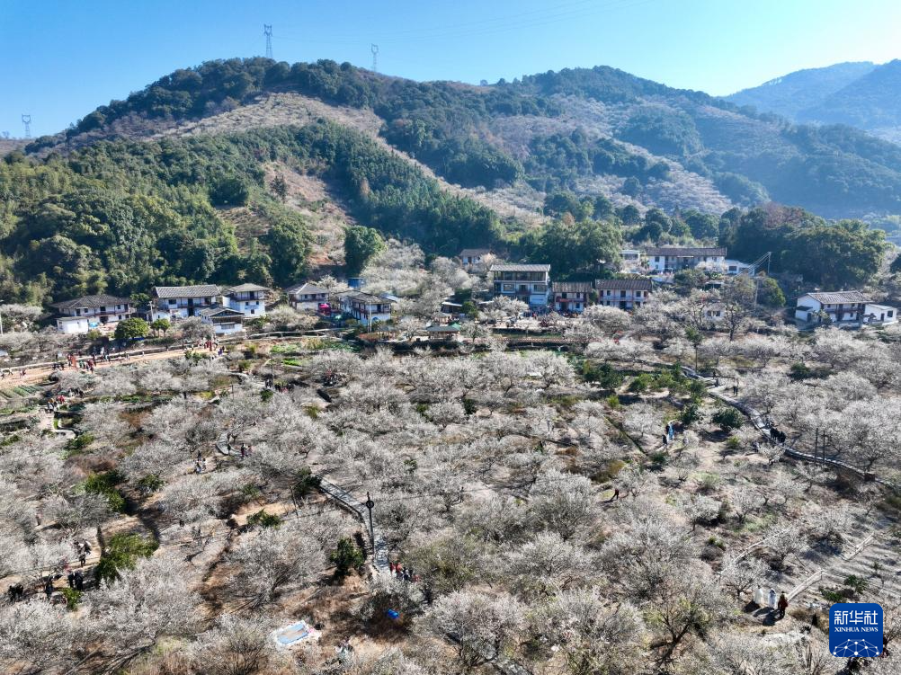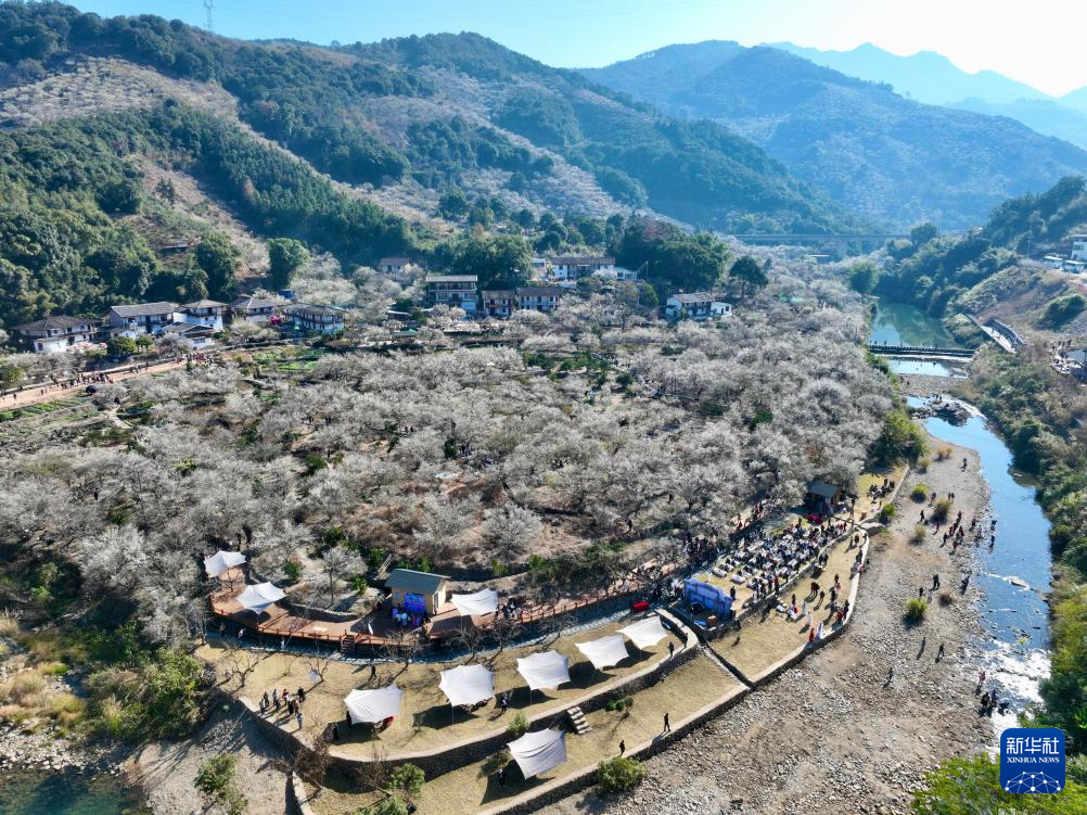 时值青梅绽放时节,1月10日,福建省福州市永泰县一年一度的梅花季系列活动在葛岭镇溪洋村文埕湾拉开帷幕,吸引众多游客前来打卡游玩。