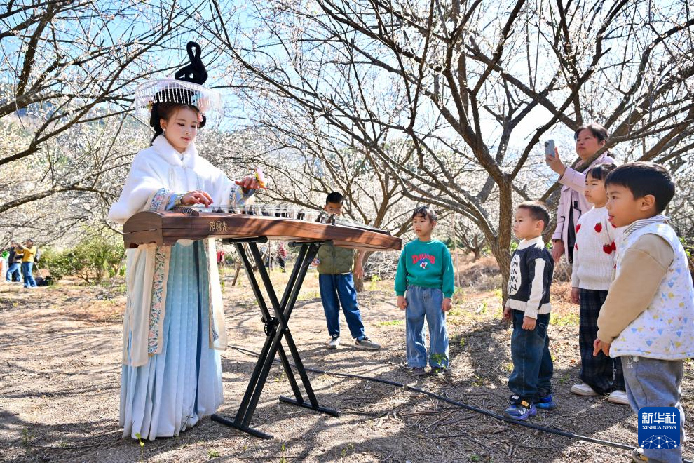 1月10日,在福建省永泰县葛岭镇文埕湾,一名表演古筝的女孩吸引游客驻足。