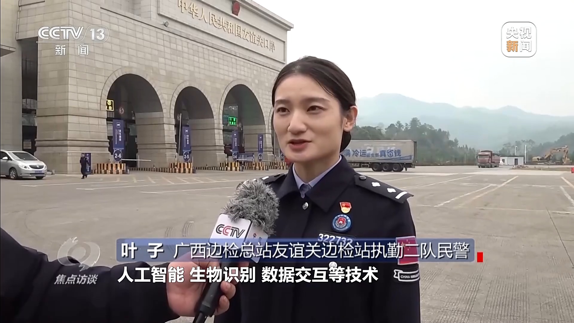 广西边检总站友谊关边检站执勤二队民警叶子:我们整合了人工智能、生物识别、数据交互等技术,实现车辆和司机预先备案、自主采集、快速核验三步即可通关,让数据先跑、货车秒过成为现实。