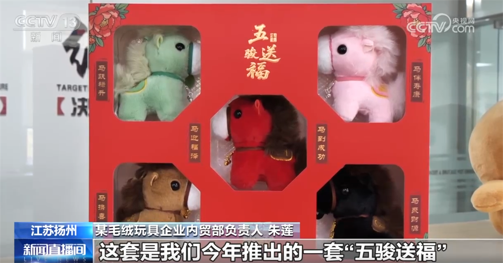 江苏扬州某毛绒玩具企业内贸部负责人朱莲:这套是我们今年推出的“五骏送福”,五色小马寓意“福、禄、寿、喜、财”。年前已经接到20万套订单,目前正在加班加点赶制,春节前交付。