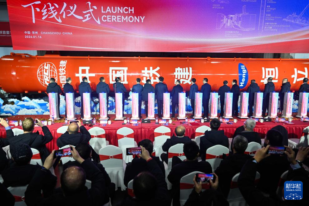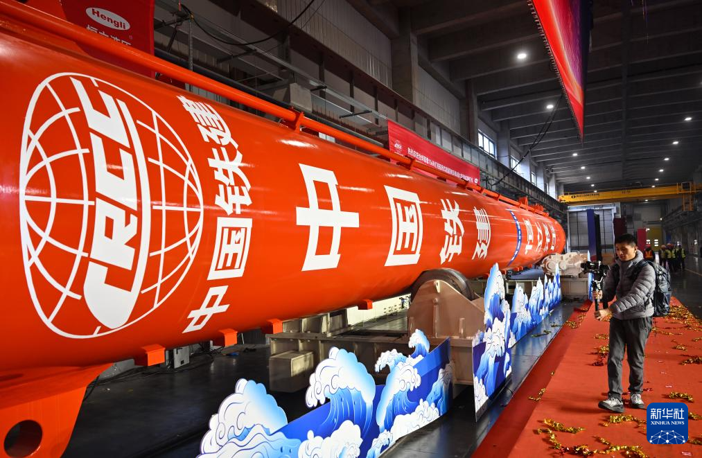 1月16日拍摄的由中国铁建大桥局投资建造的超大超长打桩船启闭油缸下线仪式。