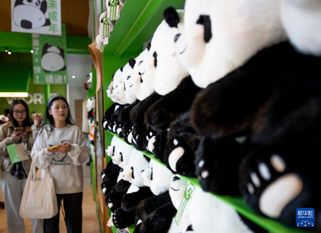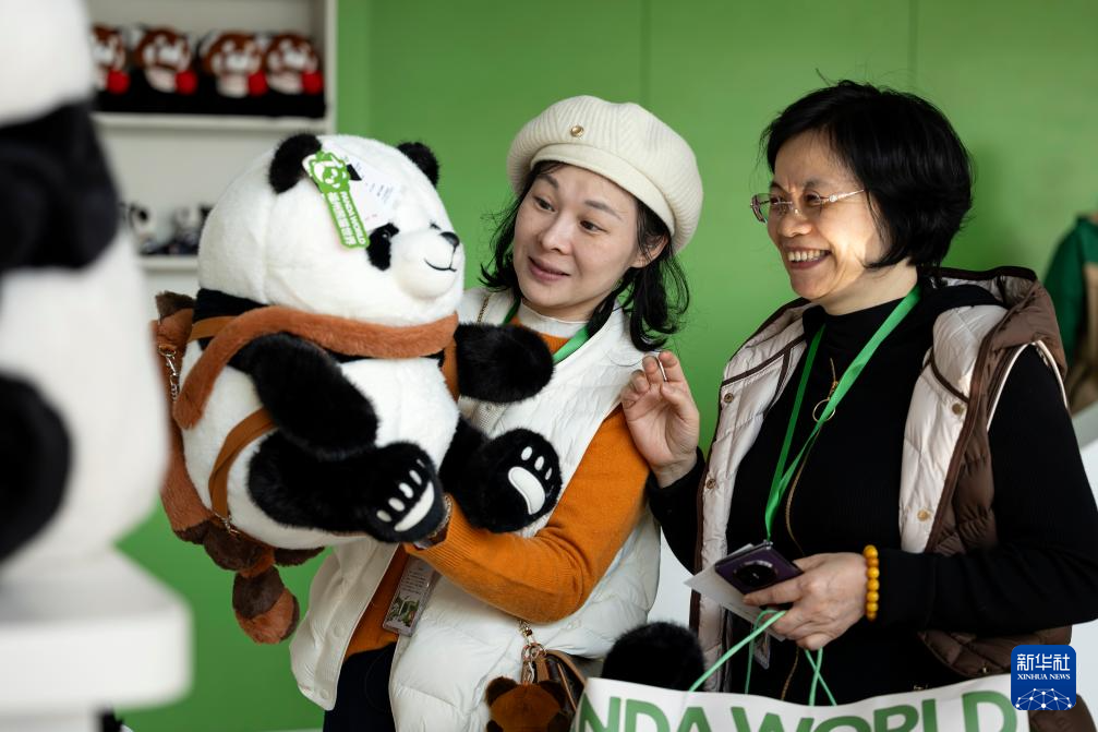 1月17日,游客在文创售卖区选购大熊猫文创产品。