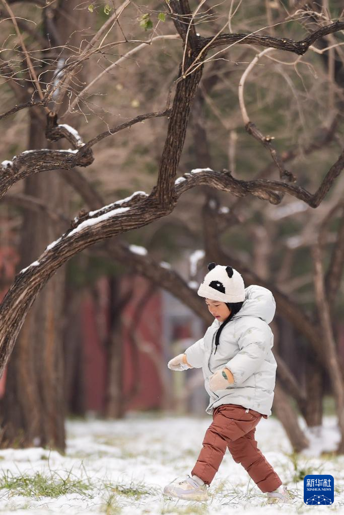 1月18日,小朋友在北京景山东街的路边玩雪。