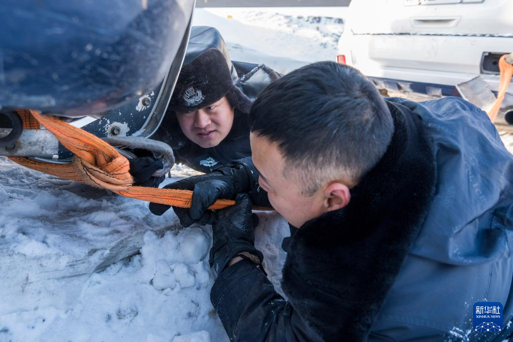 阿勒泰地区公安局喀纳斯景区分局交通管理大队民警唐志力·哈勒肯在帮助受困车辆脱困(1月16日摄)。