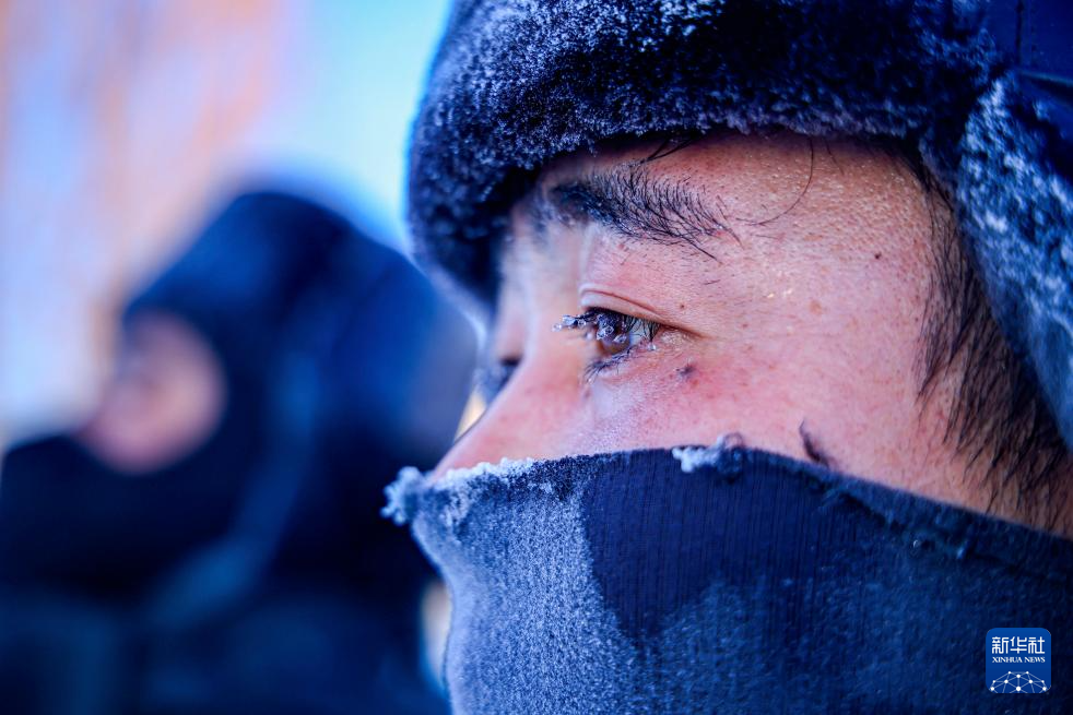 在新疆阿勒泰地区富蕴县吐尔洪乡,在巡检的供电所员工脸上凝结冰霜(1月16日摄)。