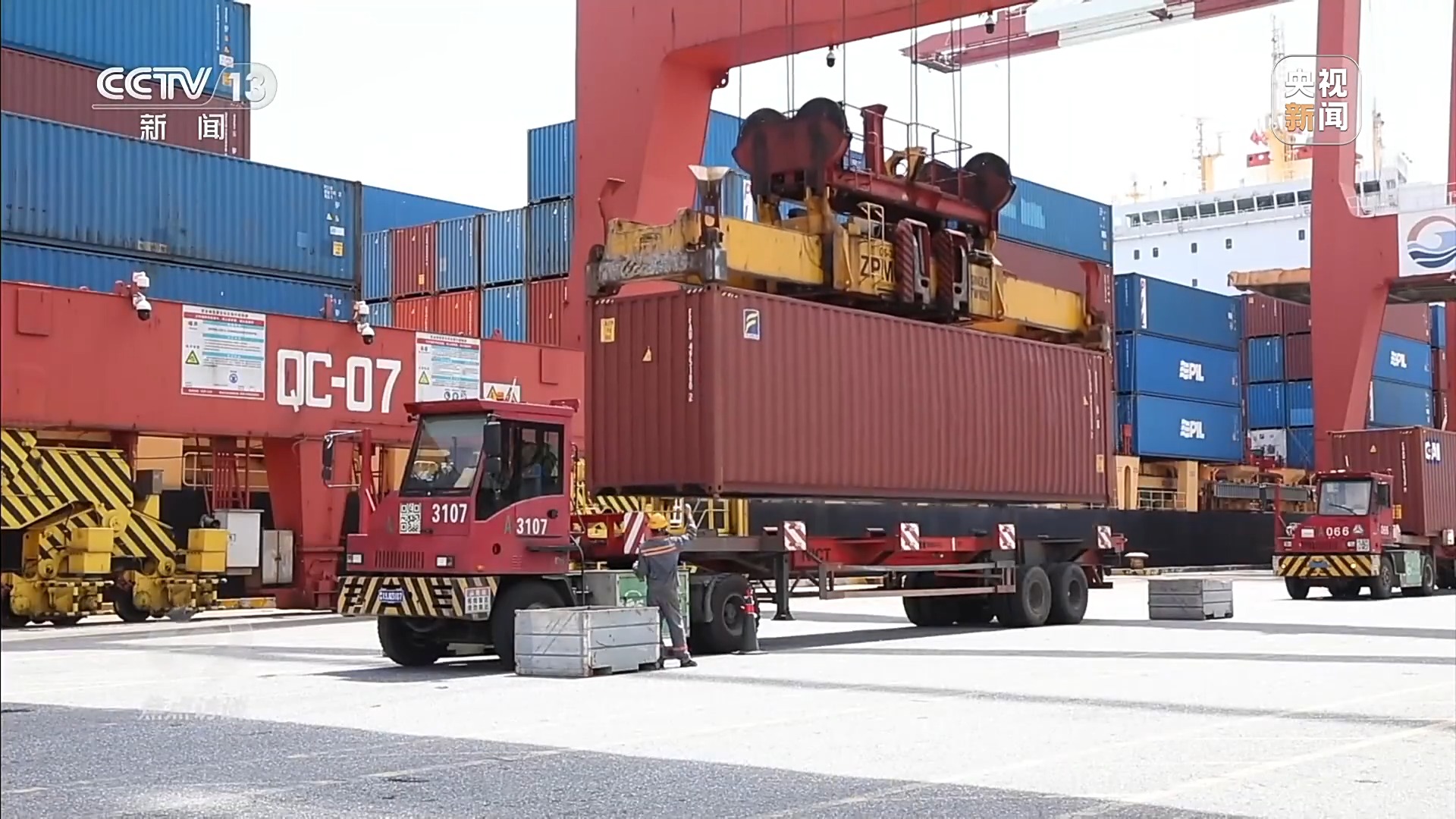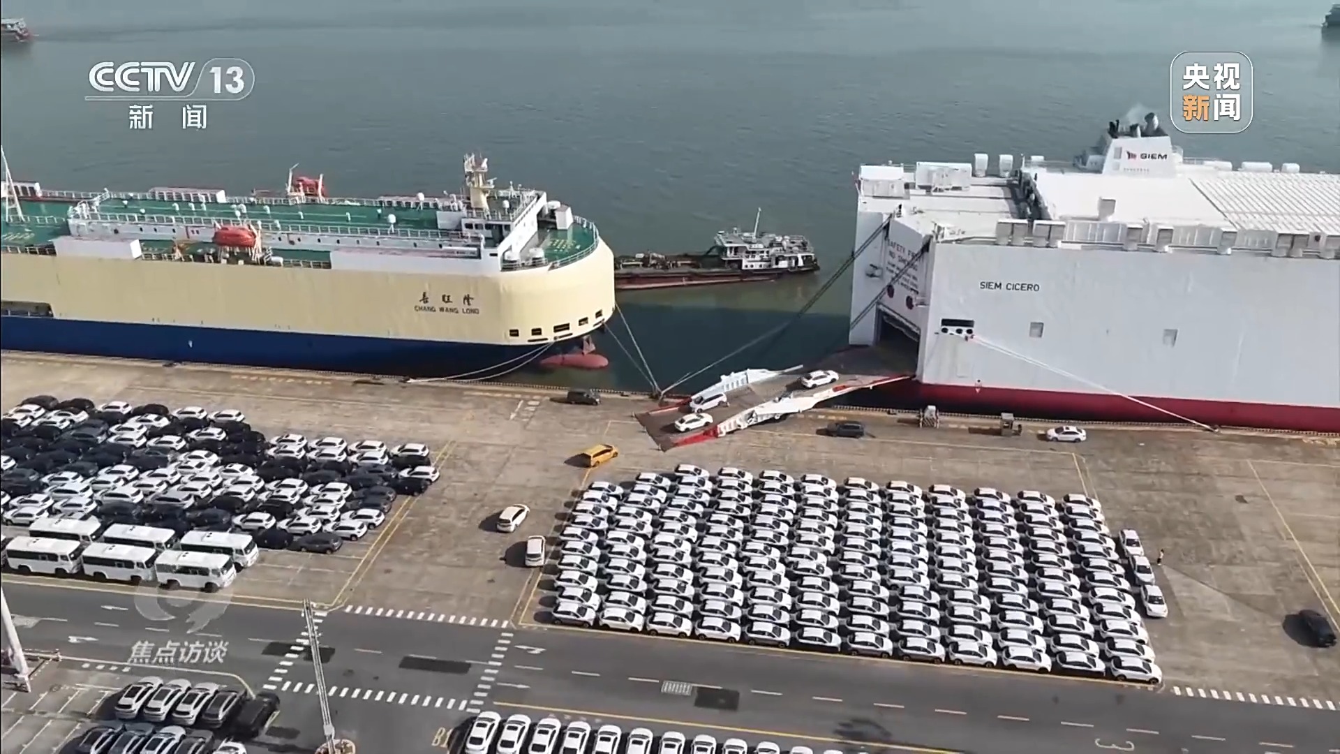 广州港南沙汽车码头有限公司总经理助理陆春荣:打造了七船同靠并行作业的高效级运营模式,我们通过科学船舶调度,还有资源整合,实现了单船超过4000台汽车的装卸作业,在24小时内完成常态化高效标准。