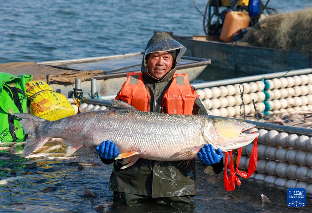 1月31日,渔民在2026溱湖湾冬捕活动现场展示捕获的大鱼。