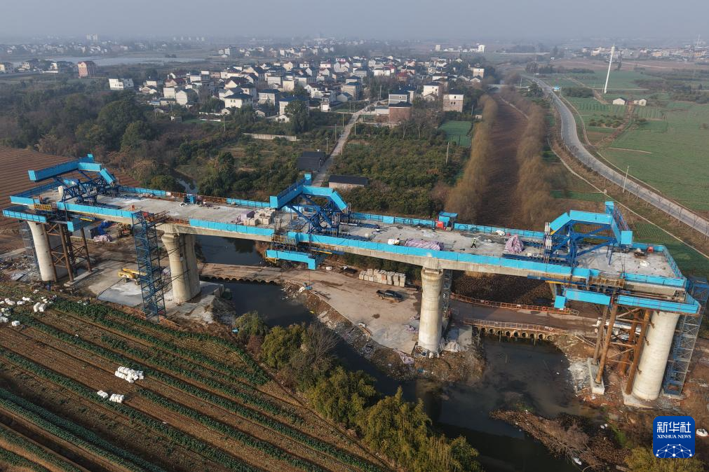 2月3日拍摄的衢丽铁路衢江特大桥跨芝溪连续梁(无人机照片)。