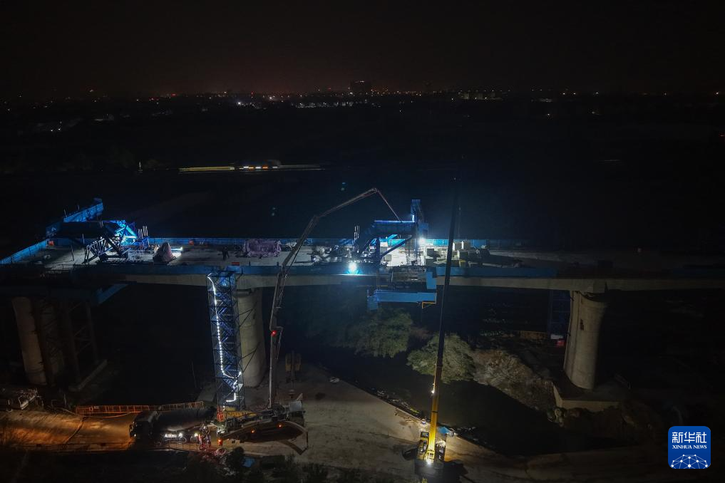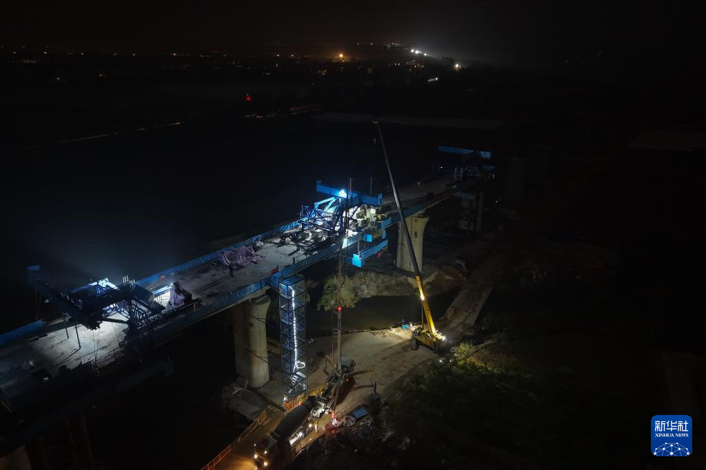 2月3日凌晨拍摄的衢丽铁路衢江特大桥跨芝溪连续梁合龙施工现场(无人机照片)。